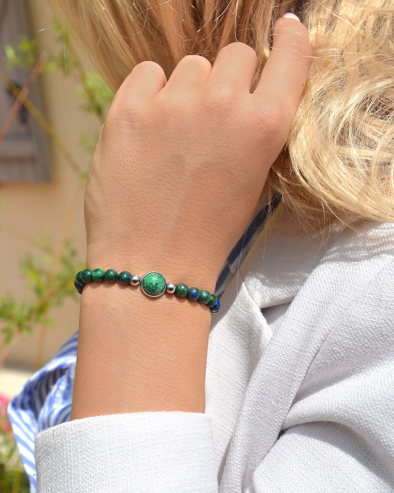 Das Naturstein Armband Ciconio ist aus traumhaften Chrysokoll gefertigt. Das Mittelstück ist ein, mit Edelstahl verzierter Cabochon, der Ihr Handgelenk charmant betont.