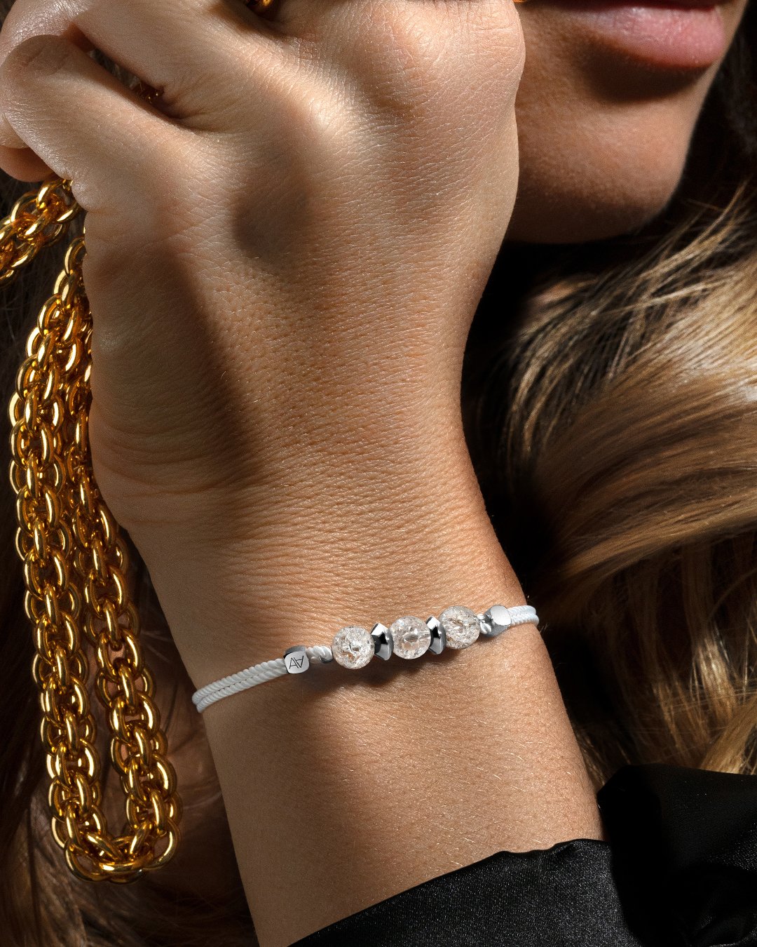 Das Armband San Geneto verkörpert durch die harmonische Kombination eines fein gewebten Baumwollbandes, sorgfältig von Hand polierter Edelstahlkomponenten und drei wunderschöner Kristallcrack Perlen, Eleganz.