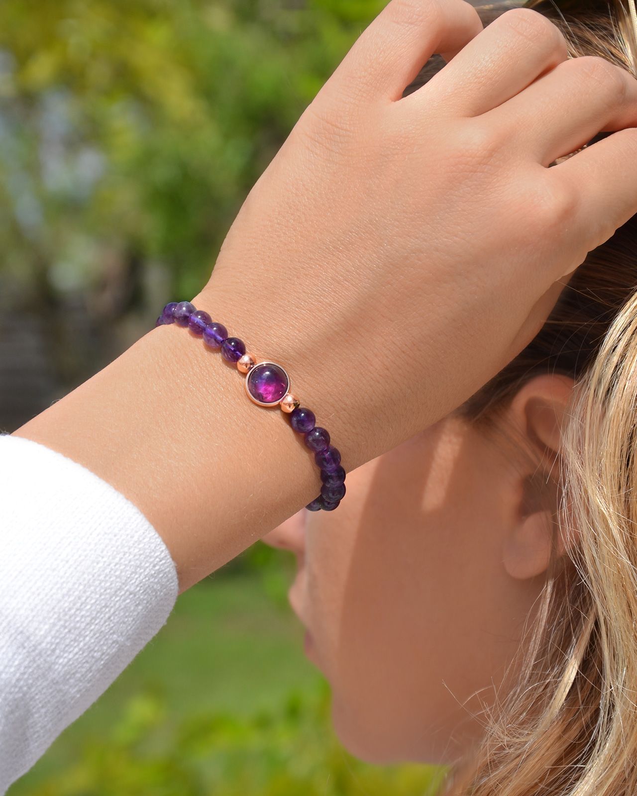 Das Naturstein Armband Foggia ist aus wunderschönem Amethyst gefertigt. Das Mittelstück ist ein, mit feinen roségoldenen Steinen umrandeter Cabochon, der Ihrem Handgelenk einen Hauch von Frische verleiht.