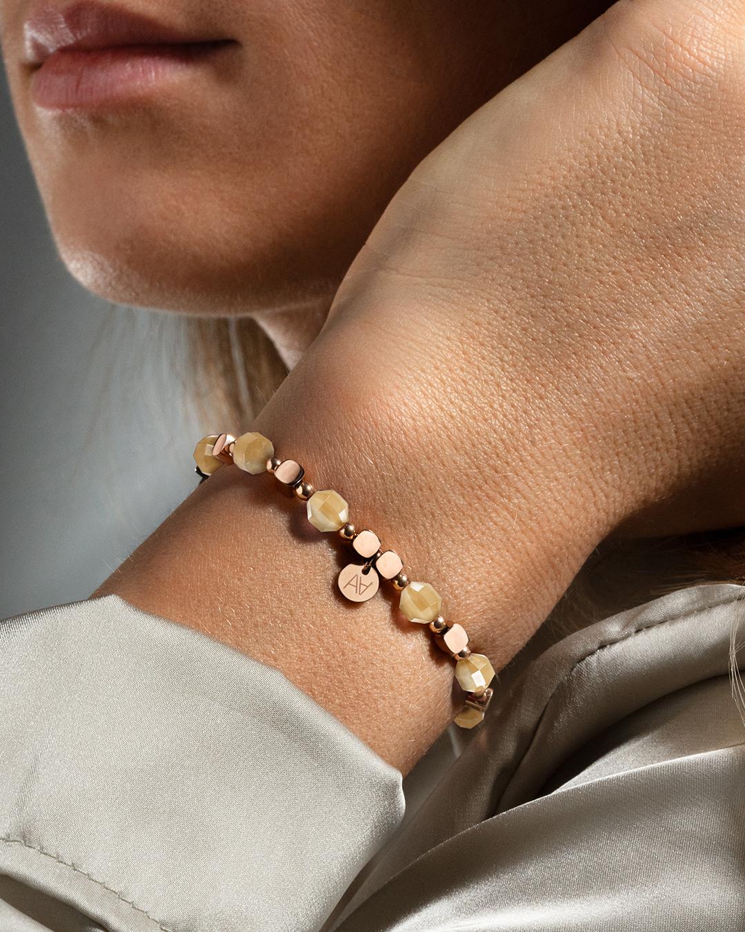 Das aus rosévergoldeten Edelstahl entworfene Armand ist mit einer handgefertigten Pastille von Anna Velazia verziert.