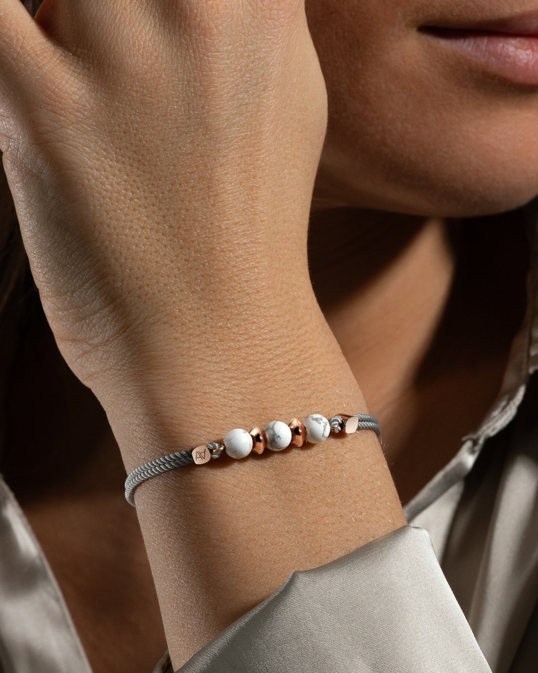 Das Armband Alcameto verkörpert durch die harmonische Kombination eines fein gewebten Baumwollbandes, sorgfältig von Hand polierter, rosévergoldeter Edelstahlkomponenten und drei wunderschöner Howlith Perlen, Eleganz und Raffinesse.