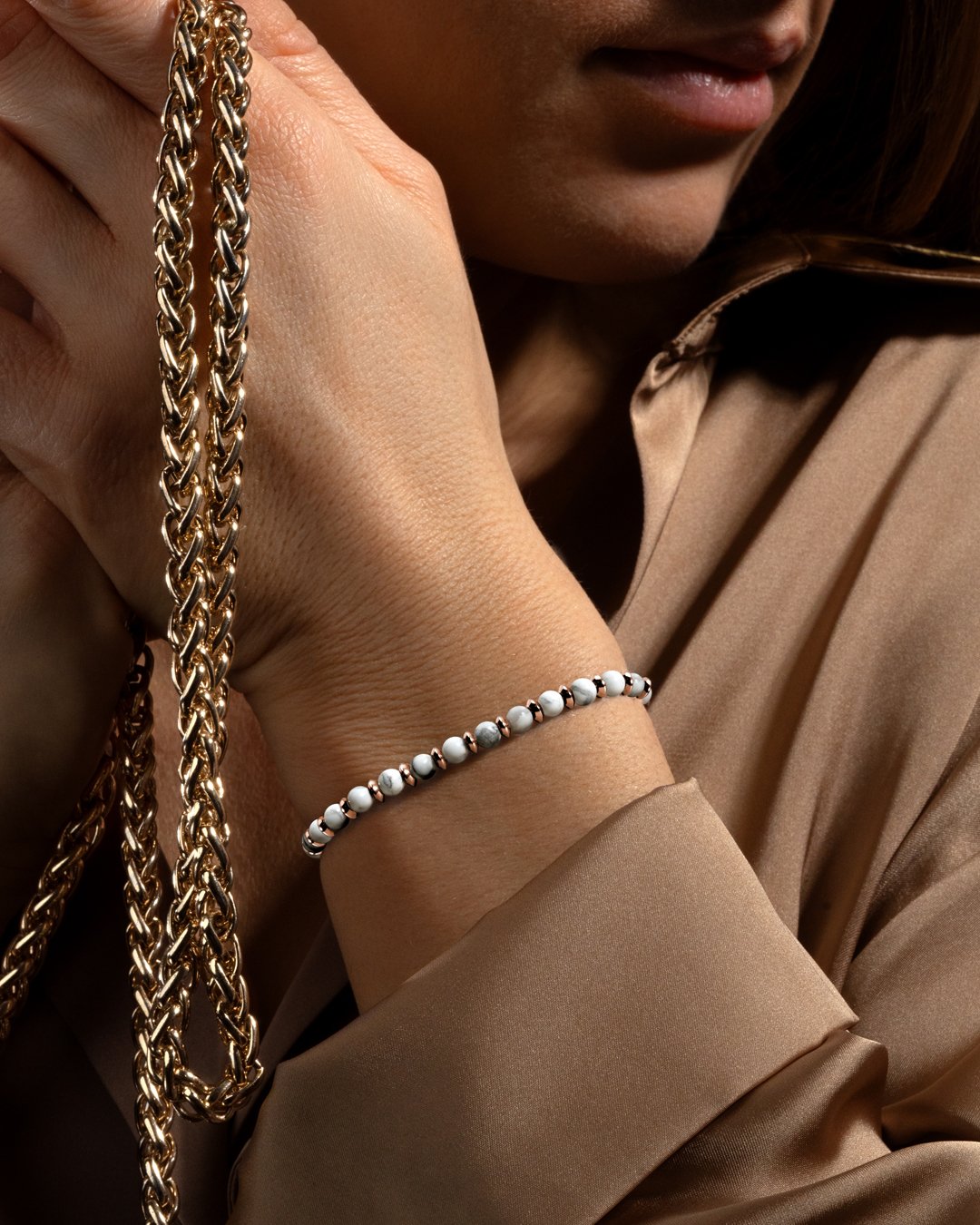 In der Lithotherapie wird der weiße Howlith als Stein der Gelassenheit bezeichnet. Er soll die Fähigkeit haben, den Geist und die Emotionen zu beruhigen. Unsere Schmuckstücke bestehen aus natürlichen Steinen, die alle unterschiedlich sind. Daher kann es je nach Modell zu Abweichungen in der Größe und den Farbnuancen kommen. Es sind diese Unterschiede, die jeden Stein einzigartig machen.Die Anzahl der Natursteine kann von Armband zu Armband variieren