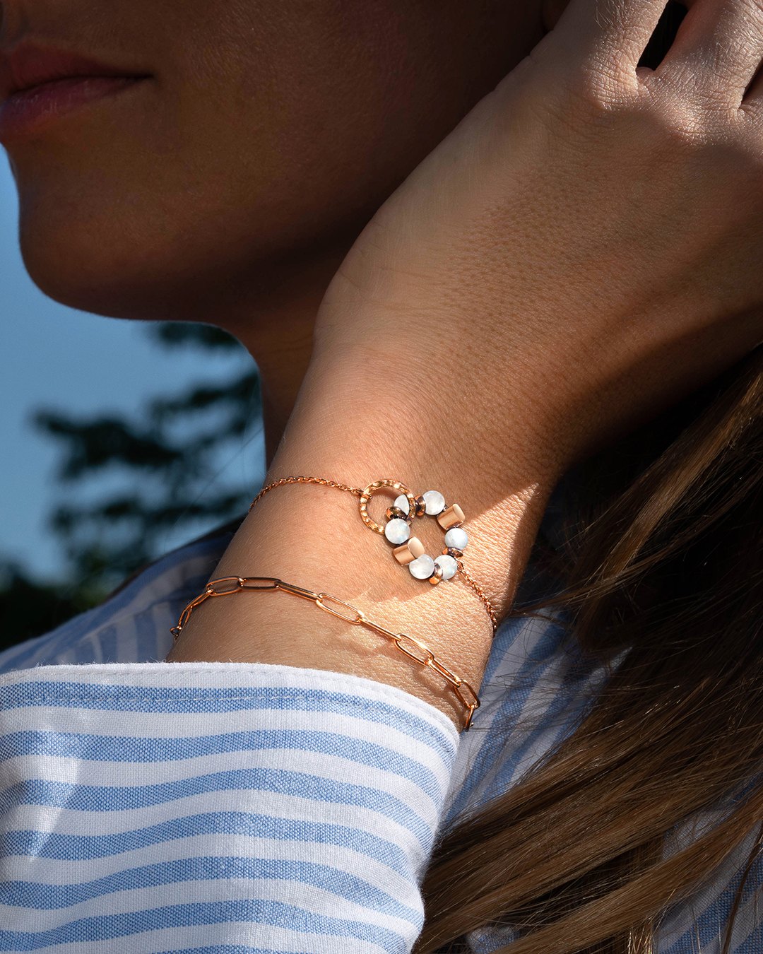 Das Armband Selena besteht aus einer zarten rosévergoldeten Edelstahlkette, die in der Mitte von einem floralen Motiv aus Mondstein veredelt wird, verflochten mit einem gehämmerten Ring aus roséfarbenem Edelstahl.