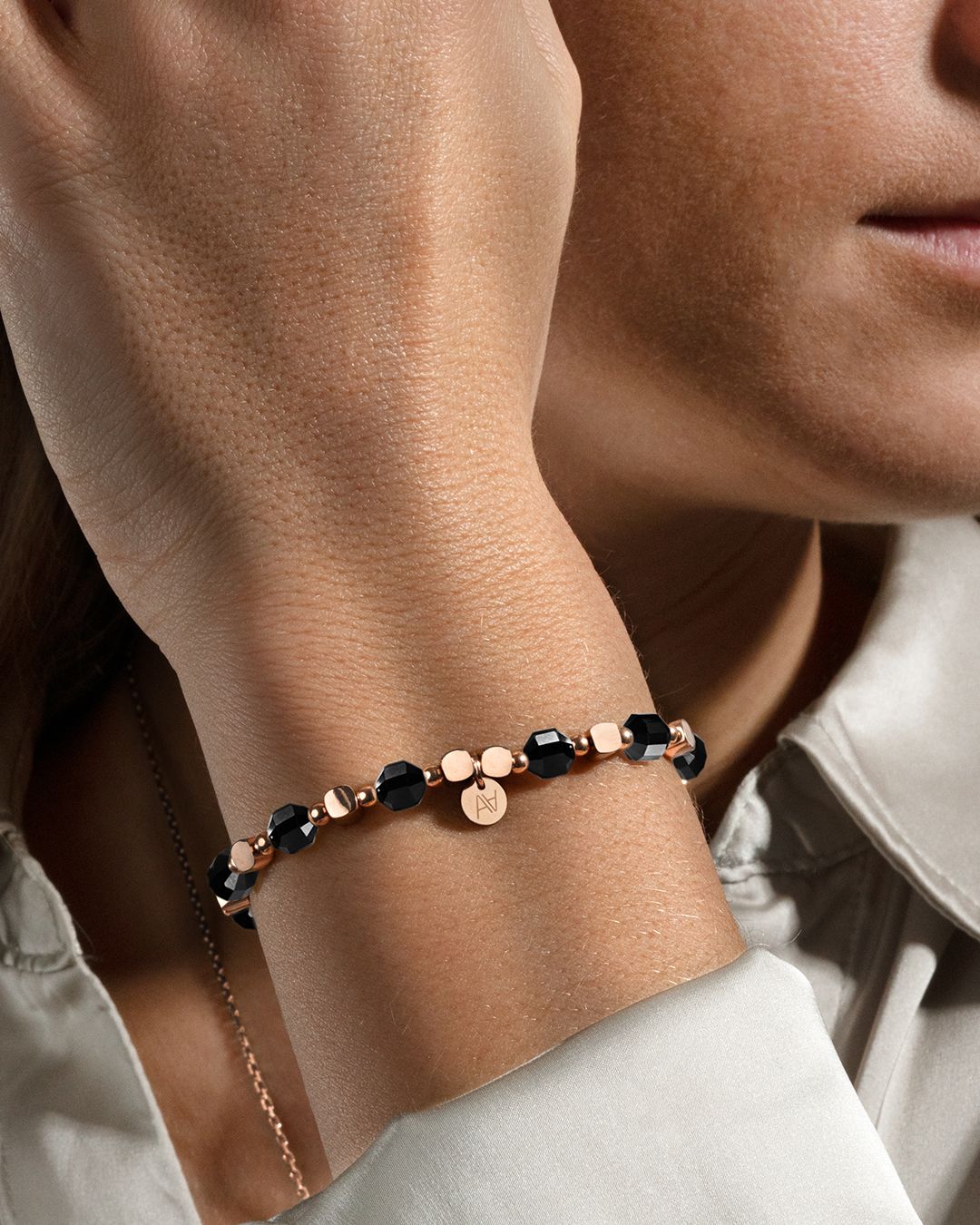Das aus rosévergoldeten Edelstahl entworfene Armand ist mit einer handgefertigten Pastille von Anna Velazia verziert.