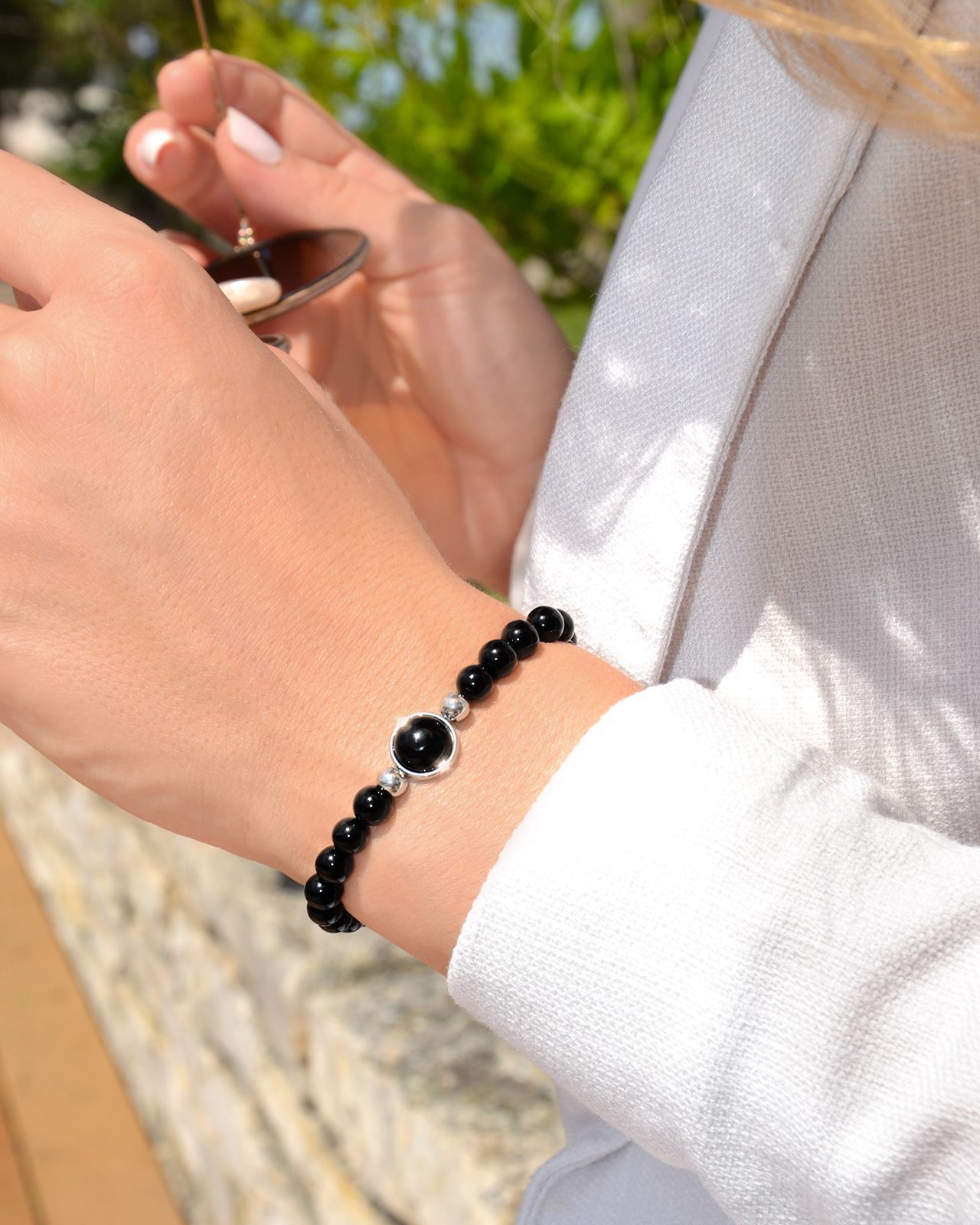Das Naturstein Armband Priacco ist aus wunderschönem schwarzem Onyx gefertigt. Das Mittelstück ist ein, mit feinem Edelstahl verzierter Cabochon mit seinem Stein, der diesem Schmuckstück an Volumen schenkt.