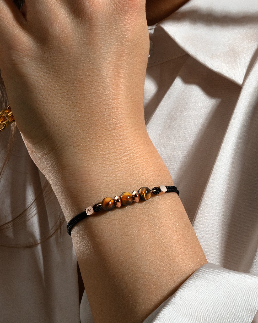 Das Armband Messineto verkörpert durch die harmonische Kombination eines fein gewebten Baumwollbandes, sorgfältig von Hand polierter rosévergoldeter Edelstahlkomponenten und drei wunderschöner Tigeraugen Perlen, Eleganz.