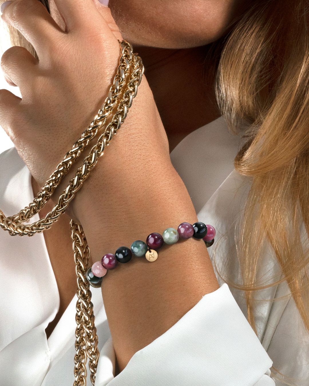 Das Armband Parma besteht aus einem wunderschönen, mehrfarbigen Turmalin, der aus 8 mm großen Natursteinen gefertigt ist und mit einem Plättchen mit dem Logo der Marke Anna Velazia verziert ist. Die Pastille ist aus rosévergoldetem Edelstahl gefertigt.