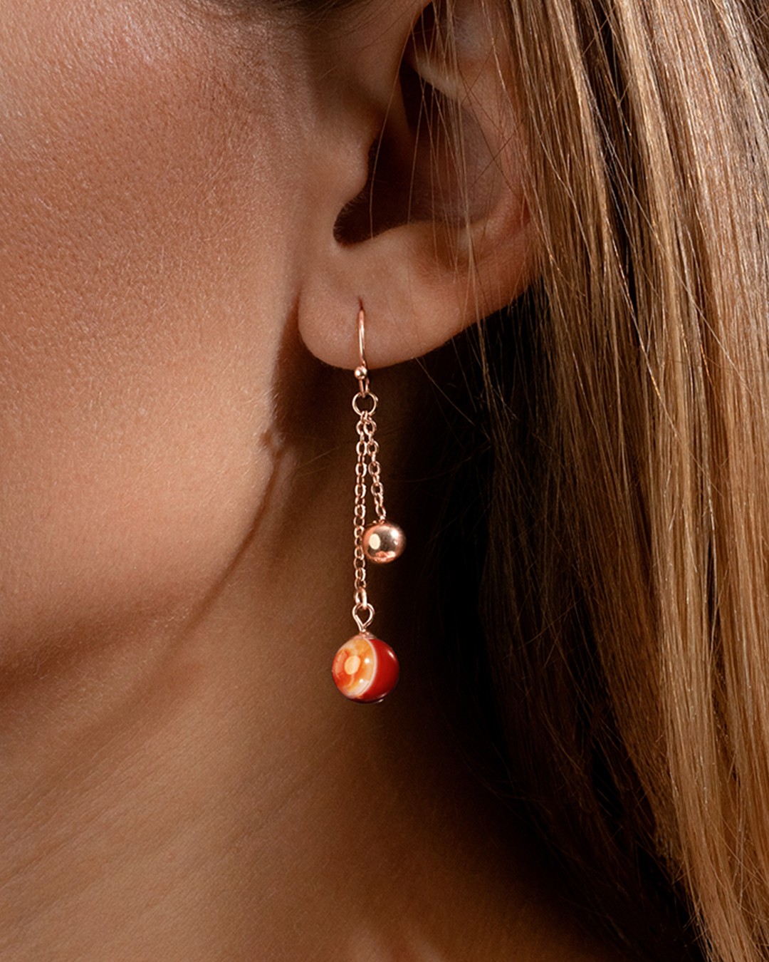 Die Ohrringe Rossoni sind mit einem gestreiften roten Achatstein und einer roséfarbenen Kugel aus Edelstahl verziert.In der Steinheilkunde wird der rote Achat als Stein der Harmonie und des inneren Gleichgewichts bezeichnet. Er ist bekannt für seine emotionalen Stabilitäts-, Erdung- und Schutzkräfte.Unsere Schmuckstücke bestehen aus natürlichen Steinen, die alle unterschiedlich sind. Daher kann es je nach Modell zu Abweichungen in der Größe und den Farbnuancen kommen. Diese Unterschiede machen jeden Stein zu einem Unikat.