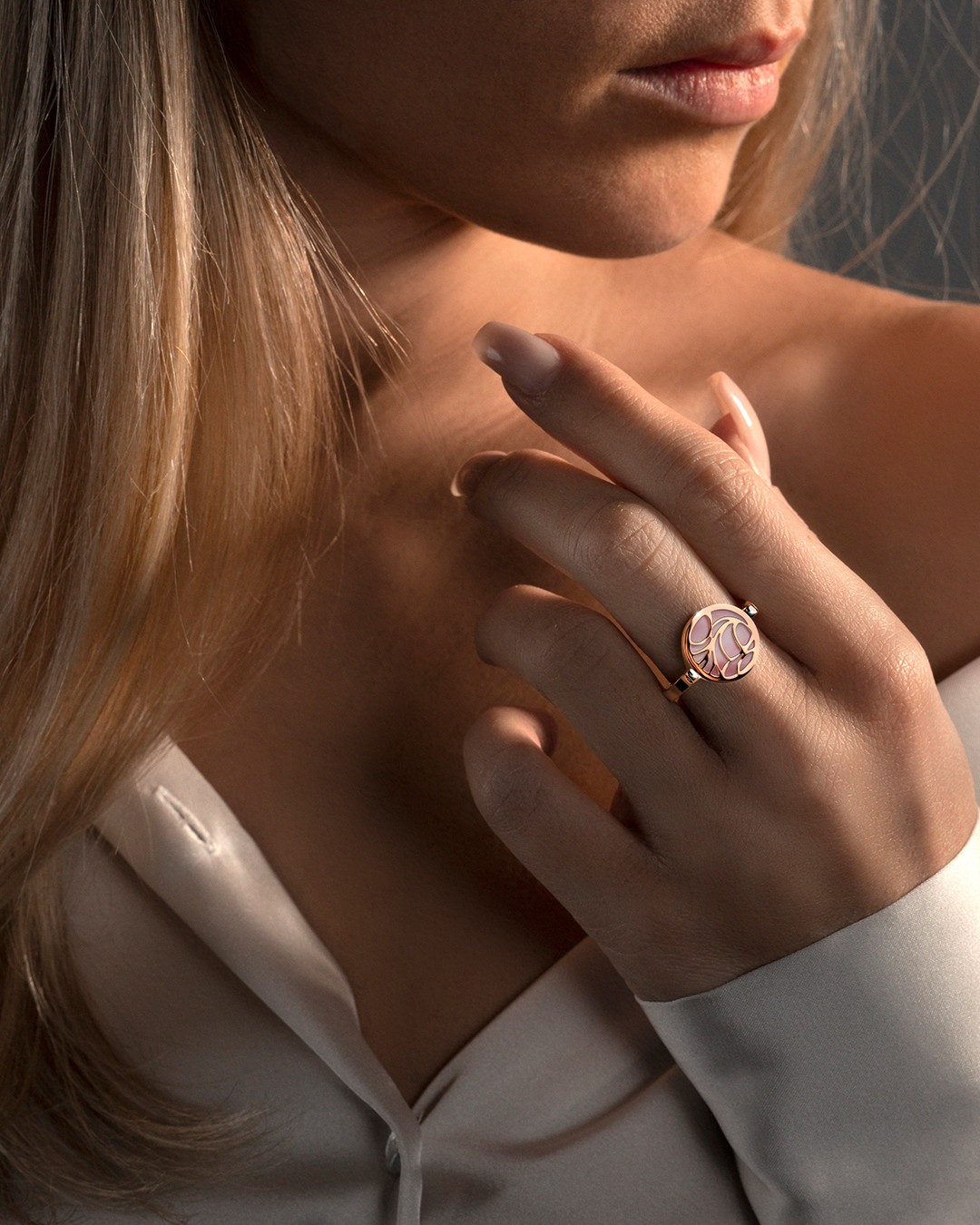 Dieses Schmuckstück präsentiert ein abstraktes Motif, dass Leichtigkeit und Sanftheit wiederspiegelt.