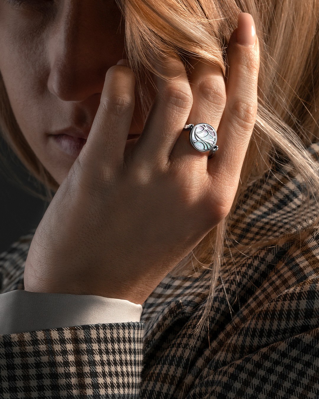 Dieses Schmuckstück präsentiert ein abstraktes Motif, dass Leichtigkeit und Sanftheit wiederspiegelt.